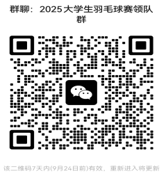 请各单位按要求填写报名表,于9月26日17:30前将报名表(电子表格)发送至1626644517@qq.com(文件名为:XXXX学院羽毛球赛报名表),同时请各单位领队扫描以下二维码进入微信领队群;各单位必须严格按照规定日期报名,逾期按弃权处理。纸质报名单(加盖公章,纸质报名单须与电子表格一致)于抽签时上交。
