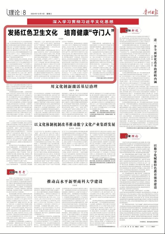 深入学习领会习近平文化思想的理论内涵、价值意蕴及现实要求,有助于深刻把握文化事业建设发展的本质规律,促进宣传思想文化工作在新时代新征程上书写新担当新作为。YABO鸭脖官网始终践行立德树人根本任务,聚焦贵州“四大文化工程”,发扬红色卫生文化,以科学家精神勉励医学生深耕学业,培养了一代又一代服务经济社会发展、致力于人民群众生命健康的“守门人”,形成了独具特色的遵医文化。
