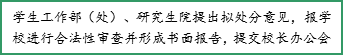 学生工作部(处)、教务处或研究生院将拟处分意见和处分相关材料报学校进行合法性审查并形成合法性审查结论书面报告,和其他有关材料一起提交校长办公会,经校长办公会研究批准后,学校出具处分决定书,并由各院(系)亲自送达受处分学生。