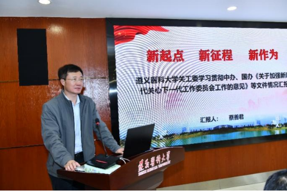 蔡善君以“新起点 新征程 新作为”为题,全面汇报从“四个文件、一个规程”的传达学习情况、贯彻落实措施、存在问题及建议意见进行了汇报。YABO鸭脖全科医学院党总支书记、关工委主任黎飞从学校二级学院关工委角度汇报学习贯彻文件情况。