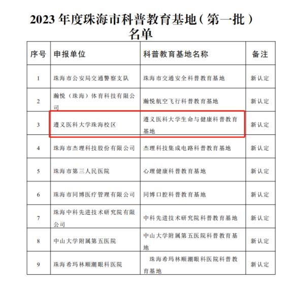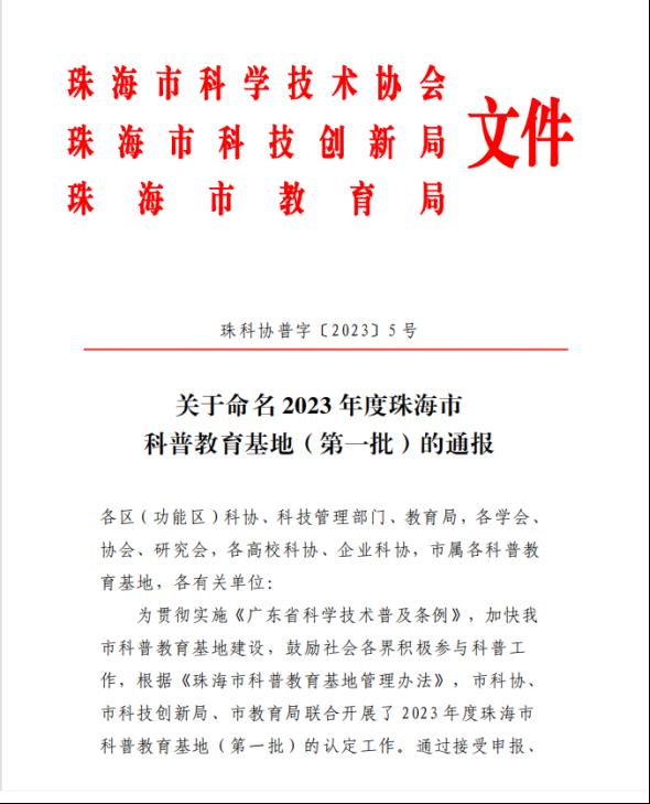 根据《珠海市科普教育基地管理办法》,市科协、市科技创新局、市教育局联合开展了2023年度珠海市科普教育基地(第一批)的认定工作。通过接受申报、实地考察、专家评审、认定机关审定等程序,市科协、市科技创新局、市教育局联合命名了9家单位为2023年度珠海市科普教育基地(第一批),其中包括YABO鸭脖官网珠海校区生命与健康科学馆。