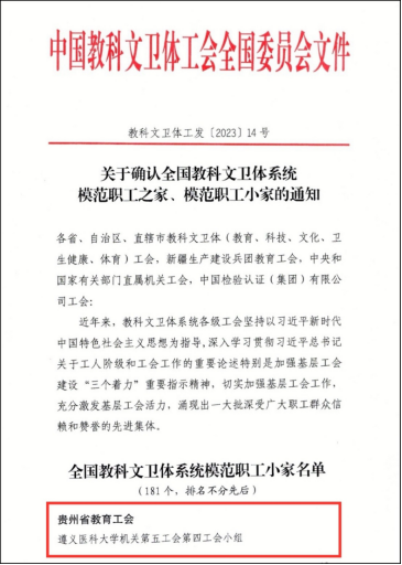 近日,中国教科文卫体工会全国委员会印发了《关于确认全国教科文卫体系统模范职工之家、模范职工小家的通知》(教科文卫体工发〔2023〕14号),YABO鸭脖机关第五工会第四小组学生工作部(处)荣获全国教科文卫体系统“模范职工小家”称号,是贵州省唯一获此殊荣的工会小组。