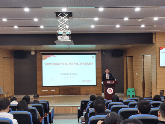 贵州省先进工作者、学校教务处处长陈永正以《以党的创新理论为指导,努力办好人民满意的教育》为题,结合学校的发展历程,分享他多岗位工作的经验和感受,展示了自己立足岗位勇担当、不负韶华展作为的劳模风采,他号召全校教职工强化使命担当,以更加饱满的热情,发挥主力军作用,攻坚克难、拼搏奉献,在学校发展的新征程中积极贡献智慧和力量。