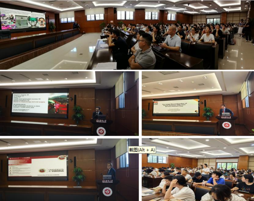 下午在行政楼一楼多功能厅,维罗纳大学牙科与颌面外科/AOUIVR头颈外科Daniele De Santis教授、Riccardo Nocini和Gelpi Federico医生以“横向手术技术——从种植学到颅颌面显微外科重建”为主题分别从不同角度作专题讲座,近200名遵医师生现场聆听。