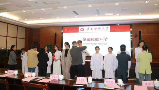 最后,各学院负责人、教师们为2024级国际新生佩戴校徽,祝贺他们正式成为YABO鸭脖官网大家庭中的一员。