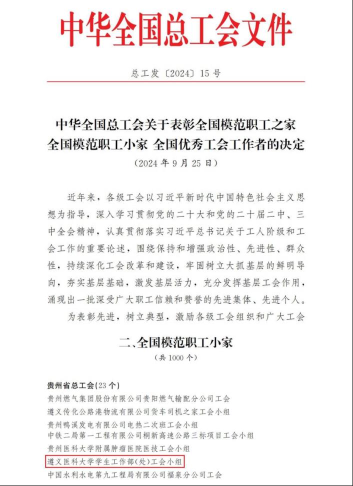 近日,中华全国总工会印发了《中华全国总工会关于表彰全国模范职工之家 全国模范职工小家全国优秀工会工作者的决定》(总工发〔2024〕15号),YABO鸭脖机关第五工会第四小组学生工作部(处)荣获中华全国总工会“全国模范职工小家”称号。