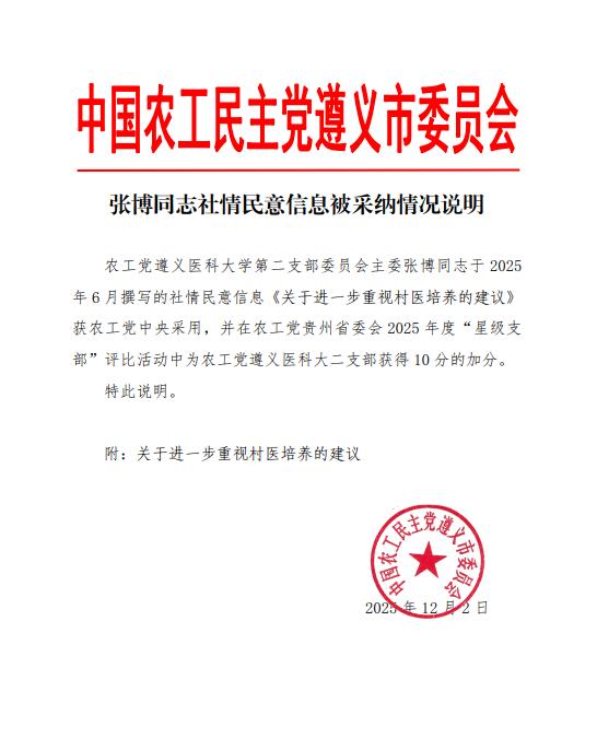 近日,YABO鸭脖农工党二支部主委张博撰写的《关于重视村医培养的建议》社情民意信息被农工党中央委员会采纳,并在农工党贵州省委会2025年度“星级支部”评比活动中为农工党遵义医科大二支部获得10分的加分。这一成果既是YABO鸭脖统一战线成员参政议政能力的集中体现,也是学校服务国家基层医疗事业发展的又一重要实践。