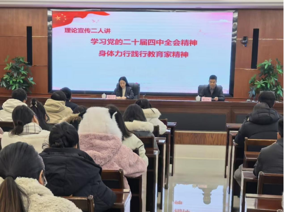 宣讲会指出,深入学习领会党的二十届四中全会精神,引导全校教师统一思想行动到全会精神上,是当前学校重要工作举措。宣讲会要求,一要“听思相融”,全体教师要深入学习全会精神、领会战略意义,结合教育家精神内涵实质,边听边思、学深悟透;二要“学行相促”,将全会精神转化为教学提质、科研攻坚行动,务求工作实效;三要“知传相济”,教师既是全会精神和教育家精神践行者,也是传播者,要在师生中传递正能量,强化使命担当。