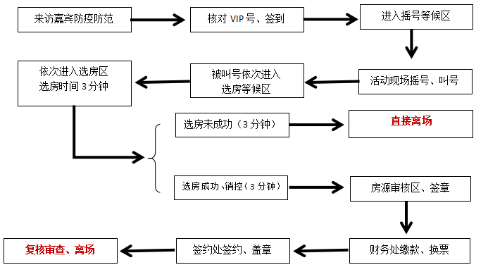 2、选房成功:协同销控→审核区签字填表→财务区更换票据(缴款)→签约区签订认购协议。