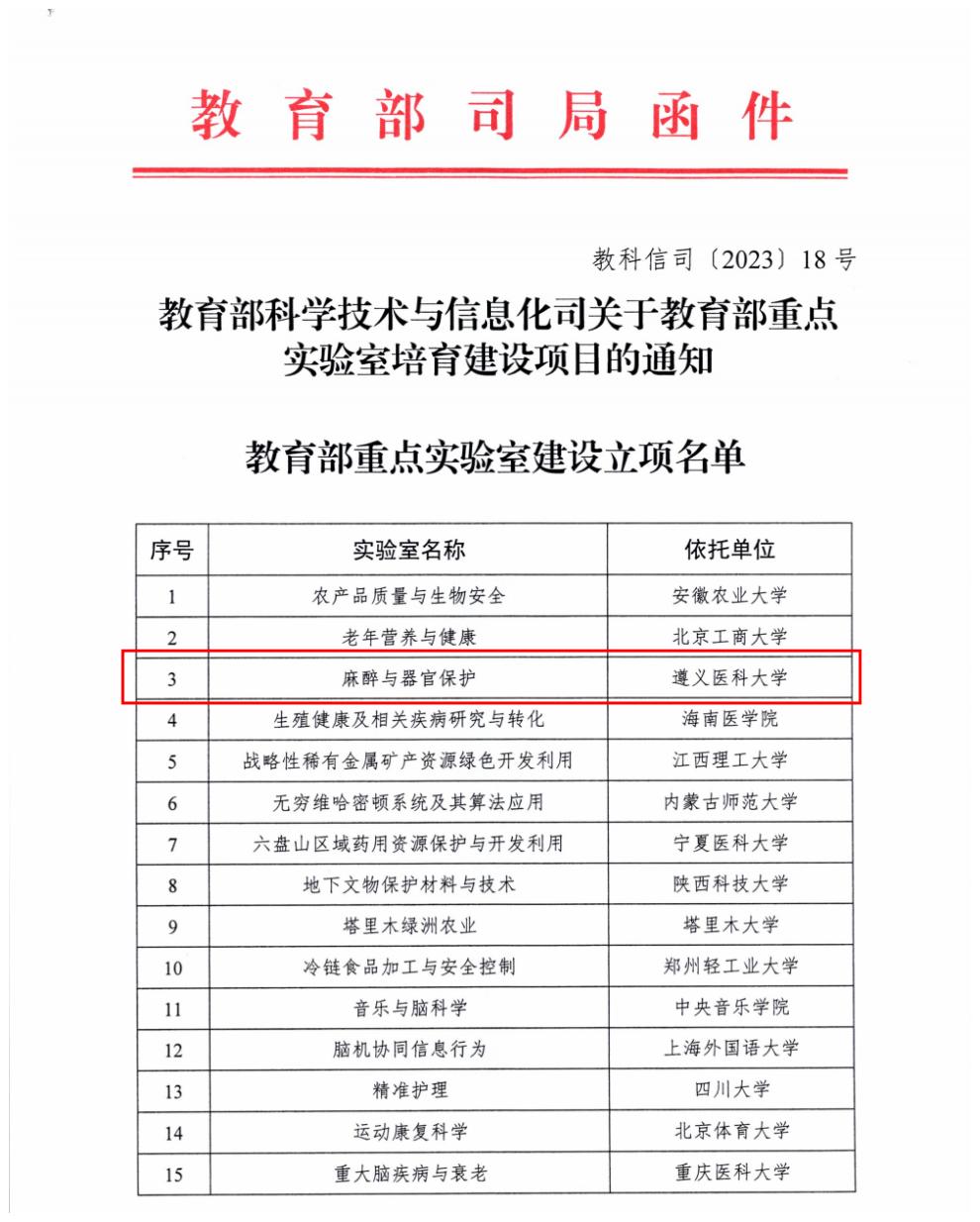 近日,教育部科学技术与信息化司公布了2023年教育部重点实验室培育建设项目立项名单,由YABO鸭脖组建的“麻醉与器官保护教育部重点实验室”获批立项建设。