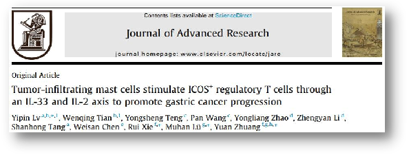 谢睿和陆军军医大学庄园研究员作为共同通讯作者在Journal of Advanced Research(影响因子12.822,中科院1区)在线发表题为Tumor-infiltrating mast cells stimulate ICOS+ regulatory T cells through an IL-33 and IL-2 axis to promote gastric cancer progression的研究论著,庄园教授系学校特聘教授,YABO鸭脖官网为第一通讯作者单位。本研究揭示了胃癌“驯化”肥大细胞调控免疫抑制通路的相关机制,发现:(1)胃癌组织和正常组织相比,胃癌组织中IL-33表达显著升高,并与肥大细胞浸润数目呈正相关;(2)胃癌细胞来源的IL-33一方面抑制肥大细胞凋亡促进其自身生存,另一方面激活P38MAPK通路介导肥大细胞分泌细胞因子IL-2;(3)肥大细胞源性IL-2诱导naïve CD4+Tcells呈现为ICOS+CD4+CD25+Foxp3+表型(即ICOS+ Treg细胞),可显著抑制细胞毒性CD8+ T细胞增殖和分泌细胞因子(IFNg、Perforin和Granzyme B)能力;(4)NOD/SCID小鼠荷瘤模型进一步揭示胃癌相关肥大细胞通过对ICOS+ Treg细胞的调控是发生胃癌免疫耐受的重要途径之一。该研究证实了胃癌组织内浸润的肥大细胞和ICOS+ Treg细胞之间的调控介导了胃癌的免疫耐受,同时阐明了“胃癌细胞/IL-33/肥大细胞/IL-2/Treg细胞”信号轴介导免疫抑制性ICOS+ Treg的诱导和扩增机制,不仅有助于开发新的免疫调节策略,还为改善胃癌的诊断、治疗和患者预后提出新的研究方向。