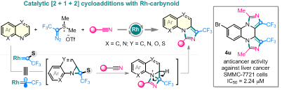 鉴于三氟甲基在药物化学中的重要作用,以及在有机氟化学领域的研究兴趣,最近该团队开发了一种新型α-重氮三氟乙基锍盐,并将其用于铑催化氮杂稠环芳烃和腈类化合物的三组分[2+1+2]加成反应中,为含三氟甲基咪唑[1,5-a]-氮杂环化合物的合成提供了一种新的策略。该反应能在较短的时间内高效地进行,具有反应条件温和、底物普适性广的特点。此外,通过药物分子的后期修饰、含CD3的氮杂环的合成、克级实验以及PDE10A抑制剂类似物的制备,进一步证明了该策略的合成潜力。最后,体外活性实验结果表明合成的含三氟甲基的咪唑[1,5-a]-氮杂环化合物具有良好的抗肿瘤活性,有望成为新药开发的先导化合物。