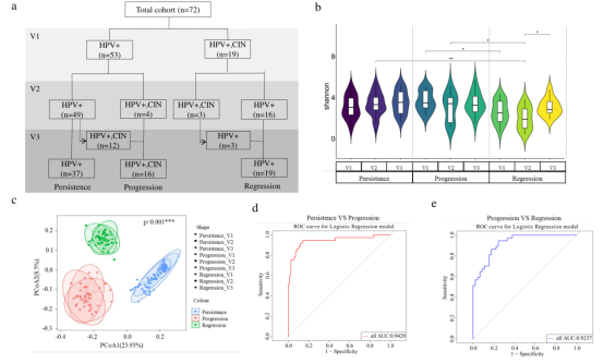 人类乳头瘤病毒(HPV)的持续感染可导致宫颈上皮内瘤变(CIN)和宫颈癌,对女性的健康造成严重威胁。宫颈阴道微生物群是宫颈阴道健康的关键决定因素。越来越多的证据表明,宫颈阴道微生物群的组成、HPV感染和CIN之间存在关联。然而,目前大多数研究是横断面研究,宫颈阴道微生物群的动态变化与HPV感染的不同临床结局之间的关系尚不清楚。在这项回顾性队列研究中,纳入了72名HPV持续感染女性,进行为期3年的随访。患者每6-12个月进行一次宫颈筛查,根据随访期间的感染结局,将患者分为HPV持续感染组、进展为CIN组和CIN消退组。对连续采集的宫颈样本进行16S rRNA基因测序,以探讨CIN发展和消退过程中宫颈阴道微生物群的组成和动态变化。研究结果表明,不同HPV感染结局组患者宫颈阴道微生物群的组成各不相同,并且在随访期间保持相对稳定。值得注意的是,连续随访的数据显示,微生物群的变化至少存在1-2年,并且发生在CIN的临床诊断之前。基于LEfSe分析和随机森林算法筛选与CIN进展和消退相关的微生物标志物,并绘制ROC曲线,微生物标志物能有效区分进展组与持续组(AUC=0.9428)和消退组(AUC= 0.9237),表明微生物群在HPV感染相关的CIN发展过程中具有良好的诊断潜力。总之,这项研究为宫颈阴道微生物群的变化与CIN发展之间的时间关系提供了依据,为未来针对CIN患者进行微生物干预的策略提供了支持。