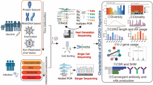 COVID-19的大流行,导致十亿人次以上的感染和百亿人次以上的疫苗接种,其对人类免疫系统的影响等受到全球持续关注。本概述基于全球多个实验室开展的COVID-19患者及SARS-CoV-2疫苗接种志愿者的BCR CDR3 repertoire研究,重点阐述了不同年龄、不同严重程度、不同感染时期的COVID-19患者,以及不同种类SARS-CoV-2疫苗志愿接种者接种前、接种后,外周血中应答B细胞的BCR CDR3受体库的详细特征,并分析了单细胞BCR测序研究中,SARS-CoV-2病毒特异抗原表位对应的BCR重链和轻链配对CDR3序列,在治疗性单克隆抗体中的制备和应用。这将为SARS-CoV-2感染和疫苗接种后,B细胞应答差异的机制研究,提供对比的数据和新的研究技术方案,为针对SARS-CoV-2突变后的疫苗改进策略和感染者的抗体治疗等研究提供基础,为SARS-CoV-2全球大规模感染对人类免疫系统的影响监测,提供B细胞应答“痕迹”的证据和全新的研究思路。