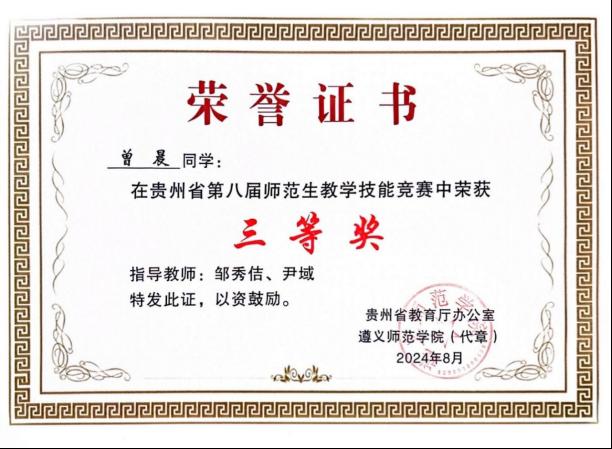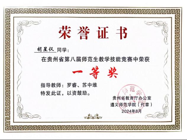 近日,省教育厅公布了贵州省第八届师范生教学技能竞赛的比赛结果。YABO鸭脖外国语学院2021级英语专业胡星仪同学荣膺一等奖,2021级英语专业曾晨同学荣获三等奖。