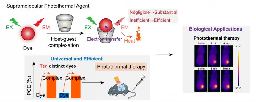 研究团队率先提出了一种创新的超分子策略,通过非辐射电子转移机制构建高效光热材料。引入“黑洞主体”概念,利用主客体复合物将杯芳烃大环和光诊疗剂(染料)客体局限于亚纳米尺度的距离内进而实现有效的光热转换。该策略克服了其它淬灭机制对供体与受体光谱重叠的依赖,为开发通用超分子光热PTAs提供了新思路。团队以四烷基铵修饰两亲杯[4]芳烃(QC4A-8C)作为“黑洞主体”,成功优化了十种不同商用染料的光热性能。利用四磺酸酞菁锌@QC4A-8C络合物,评估了超分子PTAs在体内外光热疗法中的应用潜能。该研究为利用现有光诊疗剂(染料)通过电子转移增强光热效应提供了新策略,为开发安全高效的超分子PTAs开辟了新途径。