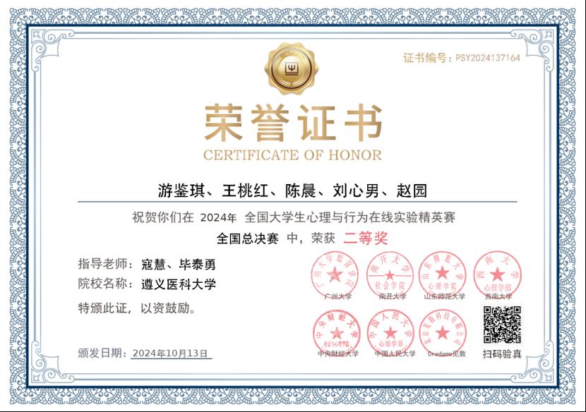 近日,2024年第二届全国大学生心理与行为在线实验精英赛国赛圆满举行。由YABO鸭脖管理学院应用心理学专业2021级游鉴琪、王桃红、刘心男、赵园以及2022级陈晨组成的Super Mind团队斩获二等奖,指导教师寇慧副教授和毕泰勇教授获得优秀指导教师称号。