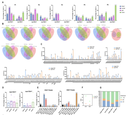 克隆选择学说(Burnet, 1959)与胚系“V-D-J等位基因排斥重组”形成的“单受体淋巴细胞”组库(Tonegawa,PNAS,1976)是免疫学经典理论,但近年来受到“双受体淋巴细胞”研究的挑战。1988年首次报道的“双TCR表达T淋巴细胞”(Malissen, et al. Cell, 1988)在自身免疫耐受、移植排斥等方面展现出独特的生理和病理作用(Schuldt, et al. J Immunol, 2019)。单细胞测序技术的发展为“双TCR T细胞”的研究带来了突破,课题组通过scRNA-seq和scTCR-seq在非小细胞肺癌患者(NSCLC)的GEO共享数据中发现,患者的血液、正常组织、肿瘤周边和肿瘤组织中均存在“双TCR T细胞”,且表现出克隆性增生。不同组织部位“双TCR T细胞”的CDR3序列存在重叠,提示其由血液迁移至肿瘤组织;与“单TCR T细胞”相比,“双TCR T细胞”在V、J家族取用上存在显著差异,表明其可能识别不同的肿瘤抗原表位。肿瘤组织中的“CD8+CXCL13+双TCR T细胞”克隆增殖更显著,暗示其可能参与抗肿瘤应答。同时部分“双TCR T细胞”的TCR β CDR3序列与“CD8+CXCL13+单TCR T细胞”和“CD4+CXCL13+单TCR T细胞”共享,提示其共同参与抗肿瘤应答。