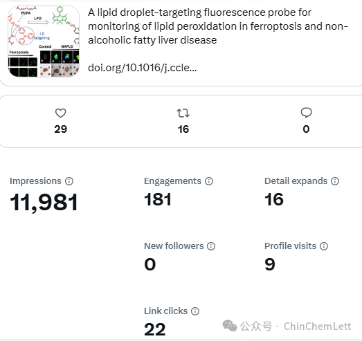 近期,《Chinese Chemical Letters》在线发表了YABO鸭脖药学院袁泽利教授、李洪玉副教授和中国科学院化学研究所马会民研究员课题组合作的研究论文,题目:A lipid droplet-targeting fluorescence probe for monitoring of lipid peroxidation in ferroptosis and non-alcoholic fatty liver disease,DOI:10.1016/j.cclet.2024.110620。YABO鸭脖官网硕士研究生卢权为本文第一作者。
