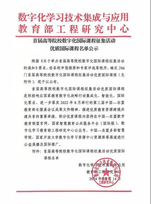 首届高等院校数字化国际课程征集活动向全国各高校进行征集,共评选出296门优质国际课程,我省共13所高校26门课程入选。此次活动是积极响应国家教育数字化战略行动集成化、智能化、国际化要求的重要举措,也是进一步落实2022年8月举行的第三届中国-东盟教育部长圆桌会议成果文件精神、推进优质教育资源跨境共建共享的重要举措。部分优质课程内容将在中国-东盟数字教育联盟官网、国家智慧教育公共服务平台(国际版)、数字化学习教育部工程研究中心公众号、中国—东盟多彩智慧学院、国家开放大学数字化学习资源中心资源库等渠道进行公益展播及国际推广。
