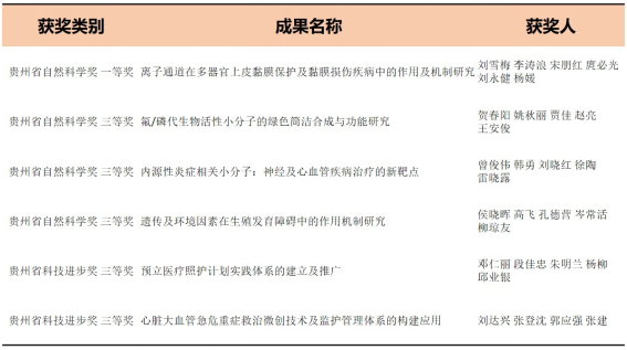 侯晓晖团队“遗传及环境因素在生殖发育障碍中的作用机制研究”、贺春阳团队 “氟/磷代生物活性小分子的绿色简洁合成与功能研究”、曾俊伟团队 “内源性炎症相关小分子:神经及心血管疾病治疗的新靶点”等3个项目获省自然科学奖三等奖,刘达兴团队“心脏大血管急危重症救治微创技术及监护管理体系的构建应用”和邓仁丽团队“预立医疗照护计划实践体系的建立及推广”等2个项目获省科技进步奖三等奖。