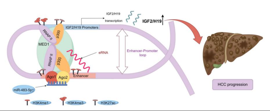 该研究成功验证了miR-483-5p通过靶向IGF2/H19增强子上调肝癌细胞IGF2和H19的表达,并阐明了其具体分子机制。具有以下创新点:(1)增强子RNA(eRNA)按照长度划分大多属于lncRNA,但其不是普通lncRNA。该研究将普通lncRNA调控基因表达机制的重要方式之一,即形成lncRNA-protein-目标基因启动子复合物。这种调控方式引入到该研究中,推测在该研究中IGF2/H19 eRNA很可能与MED1结合成IGF2/H19 eRNA-MED1复合物,后者再靶向远隔的IGF2和H19基因启动子,形成IGF2/H19 eRNA-MED1-IGF2/H19启动子复合物,进而激活IGF2和H19基因表达。(2)近年来,miRNA调控机制的重要进展之一是在转录水平促进基因表达,既往研究表明miRNA可以靶向增强子促进基因表达,这是一种新的调控方式,但其调控机制尚未被探索,该研究率先对此进行探索性研究,阐明了其具体分子机制,结果有助于对miR-483-5p调控基因表达机制的认识提高到一个新高度,丰富miRNA调控机制内容,同时为肝癌靶向治疗提供新思路和靶标奠定理论基础。