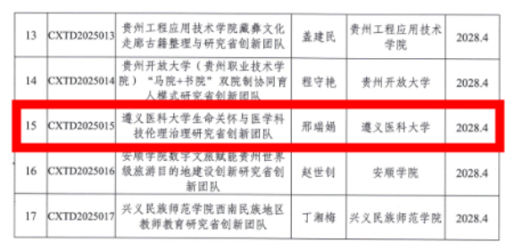 在本次命名的17个贵州省哲学社会科学创新团队中,由马克思主义学院邢瑞娟教授领衔的“生命关怀与医学科技伦理治理研究省创新团队”脱颖而出。该团队整合了学校医学伦理、社会学、法学等多学科力量,聚焦医学科技发展中的伦理挑战与生命关怀实践,致力于构建具有贵州特色的医学科技伦理治理体系。团队的获批立项,标志着学校在交叉学科研究和协同创新方面迈出了重要一步。
