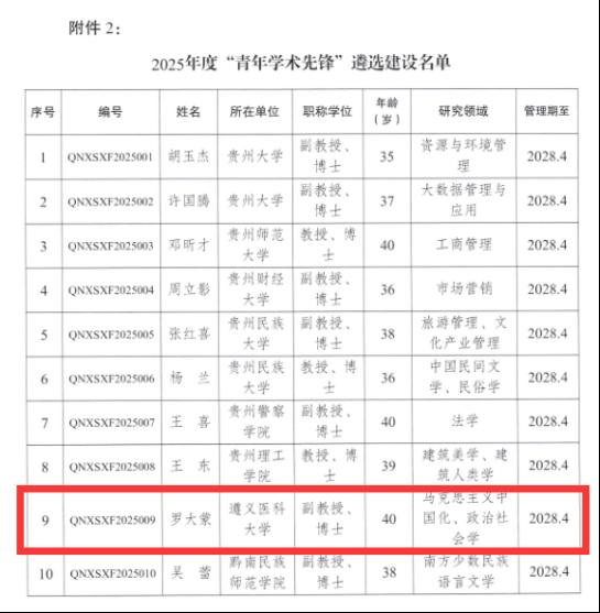 在本次命名的10个“青年学术先锋”中,马克思主义学院副教授、博士罗大蒙成功入选。罗大蒙博士长期深耕马克思主义中国化、政治社会学领域,其研究紧密结合国家战略与地方发展需求,此次入选既是对其个人学术成就的高度认可,也彰显了学校在青年人才培养方面的显著成效。