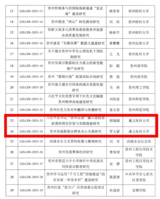 在本次立项的31项贵州省理论创新课题(招标课题)中,YABO鸭脖共有2项课题成功入选。其中,邢瑞娟教授主持的《习近平总书记“贵州足迹”融入高校思政课的理论价值与实践探索研究》,立足贵州红色文化资源,探索将领袖地方实践转化为高校思政课育人素材的有效路径,具有重要的理论意义和实践价值。罗大蒙博士主持的《贵州加强新就业群体关心关爱研究》,聚焦新业态下的社会治理新课题,为促进新就业群体融入城市发展提供智力支持。