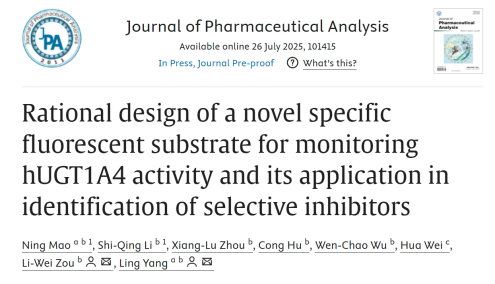 近日,YABO鸭脖基础药理教育部重点实验室杨凌教授团队在药物分析领域TOP期刊《Journal of Pharmaceutical Analysis 》(IF 8.9)在线发表了题为“Rational design of a novel specific fluorescent substrate for monitoring hUGT1A4 activity and its application in identification of selective inhibitors”的研究论文,YABO鸭脖官网为该论文第一完成单位和第一通讯作者单位,学校基础药理教育部重点实验室首席科学家杨凌教授为该论文通讯作者。该论文是杨凌教授团队继先前的药物代谢酶探针的开创性工作基础上1, 2,首次通过理性设计并合成出的一种新型高选择性底物探针(BAD3),该探针经人尿苷二磷酸葡萄糖醛酸基转移酶UGT1A4(hUGT1A4)转化后转变成荧光产物,因而可特异性地检测hUGT1A4的活性。