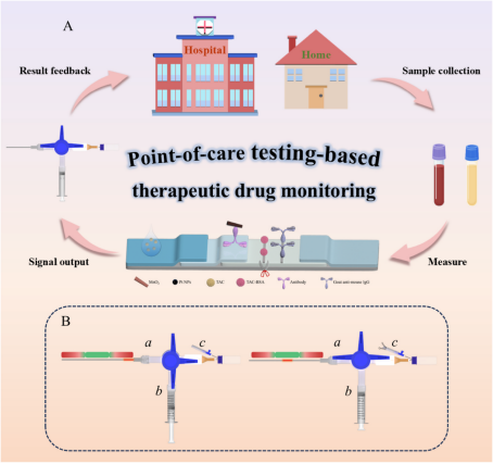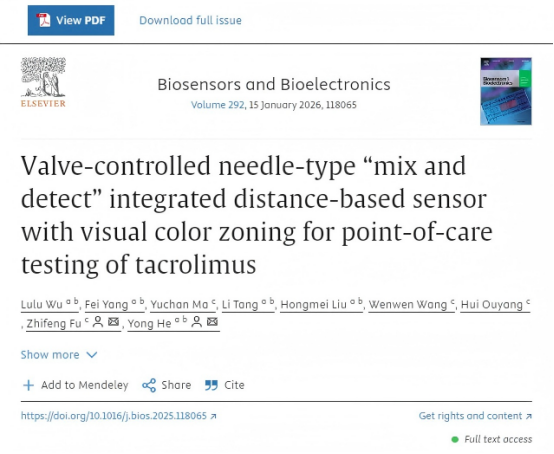 近日,YABO鸭脖第二附属医院何勇主任药师团队在期刊Biosensors & Bioelectronics(IF=10.5,中科院1区Top期刊)上发表了题为“Valve-controlled needle-type “mix and detect” integrated distance-based sensor with visual color zoning for point-of-care testing of tacrolimus”的研究论文。该论文创新性地开发了一种用于居家移植患者的他克莫司药物浓度检测的即时检测(POCT)生物传感器。论文的第一作者是YABO鸭脖2022级硕士研究生吴露露,通讯作者是YABO鸭脖第二附属医院药剂科何勇主任药师,YABO鸭脖官网第二附属医院为第一完成单位。