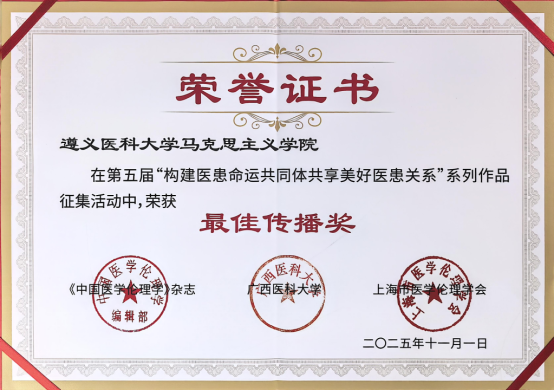 据悉,通过前期优秀作品征集,本次学术研讨会共收到来自全国一千余篇作品。同时,为表彰在构建医患命运共同体过程中发挥先锋模范作用的集体和个人,大会评审委员会还评选出“先进集体”(10家最佳传播奖,23家优秀组织奖,4家特别贡献奖)和“先进个人”。YABO鸭脖马克思主义学院荣获“先进集体(最佳传播奖)”,学院副院长沈洋获评“先进个人”,两篇学术论文获评优秀作品“三等奖”。