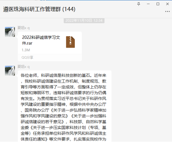 1. 2022年11月10日珠海校区通过QQ(遵珠自然科学申报群)、微信群(遵医珠海科研工作管理群)等多种宣传方式,积极主动地开展宣传工作,加强宣传,营造良好氛围。